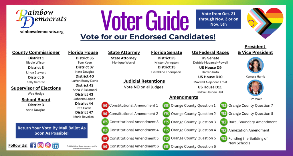 Now that the primary has passed, we have updated our Voter Guide to include Judges, Amendments, and updates for new candidates we have endorsed. If you have any questions, please contact us at info@rainbowdemocrats.org.